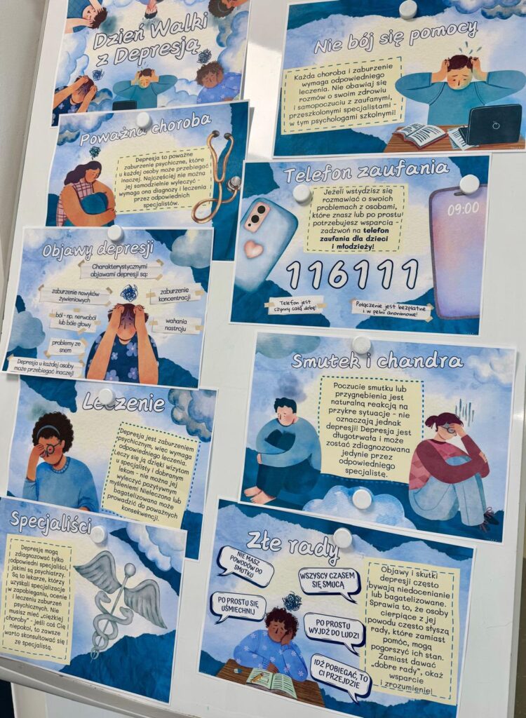 To ważna data, która przypomina nam, jak istotne jest dbanie o zdrowie psychiczne, rozmowa o emocjach oraz szukanie wsparcia wtedy, gdy go potrzebujemy. Depresja może dotknąć osoby w każdym wieku, dlatego tak ważne jest budowanie świadomości, wrażliwości i wiedzy już wśród młodych ludzi. Z tej okazji zespół pomocy psychologiczno-pedagogicznej przygotował i udostępnił ulotki informujące o tym, kiedy, jak i gdzie można uzyskać wsparcie w naszej szkole. Dodatkowo Samorząd Uczniowski zorganizował konkurs w formie quizu dotyczącego faktów i mitów na temat depresji. Była to świetna okazja do poszerzenia wiedzy oraz obalenia krążących stereotypów.